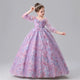 This girls' gown is made from luxurious tiers of tulle, each layer embellished with subtle sparkles that look like stars. The upper body is decorated with exquisite hand-embroidered floral patterns and diamonds, showing nobility and elegance. The soft puff sleeve design adds a sense of three-dimensionality and fantasy, and the overall shape is like a princess walking out of a fairy tale.
