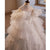 This girls' dress features a dreamy design and delicate details. The overall soft pink color tone is adorned with sparkling stripes and a fluffy feathered hemline, creating a fairy-like feel. The back is finished with a large bow in the same color, adding an air of elegance and cuteness. This gown is offered in a variety of color options to meet different style needs.